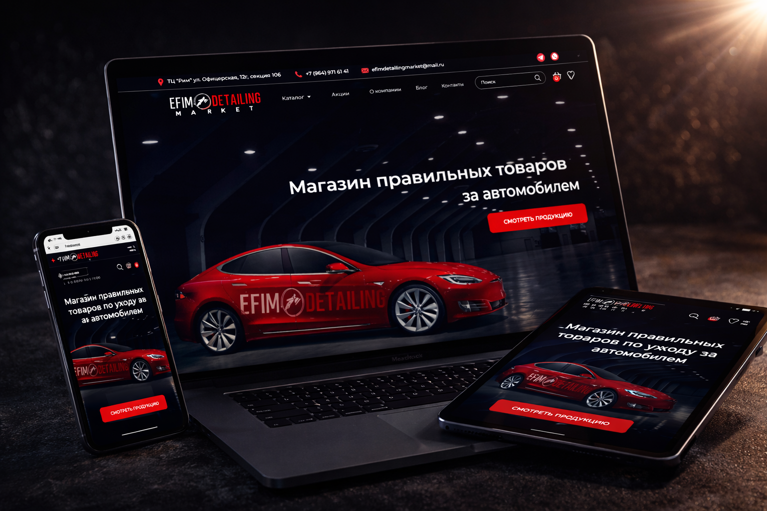 Лучшие сайты для обслуживания автомобиля продают ощущение идеального результата, а не просто банку очистителя или полировальную машинку. Красный кузов скользит по темному пространству, словно под светом студийных софитов: глянец, глубина, отражения. Efimdetailingmarket.ru продает уход еще до открытия каталога — автомобиль выглядит как объект культа, а не средство передвижения. Атмосфера главной страницы напоминает закрытый бокс детейлинга, где важны детали, блеск и контроль над каждой линией. Визуальный ритм сразу задает уровень: аккуратность, скорость, эстетика процесса.